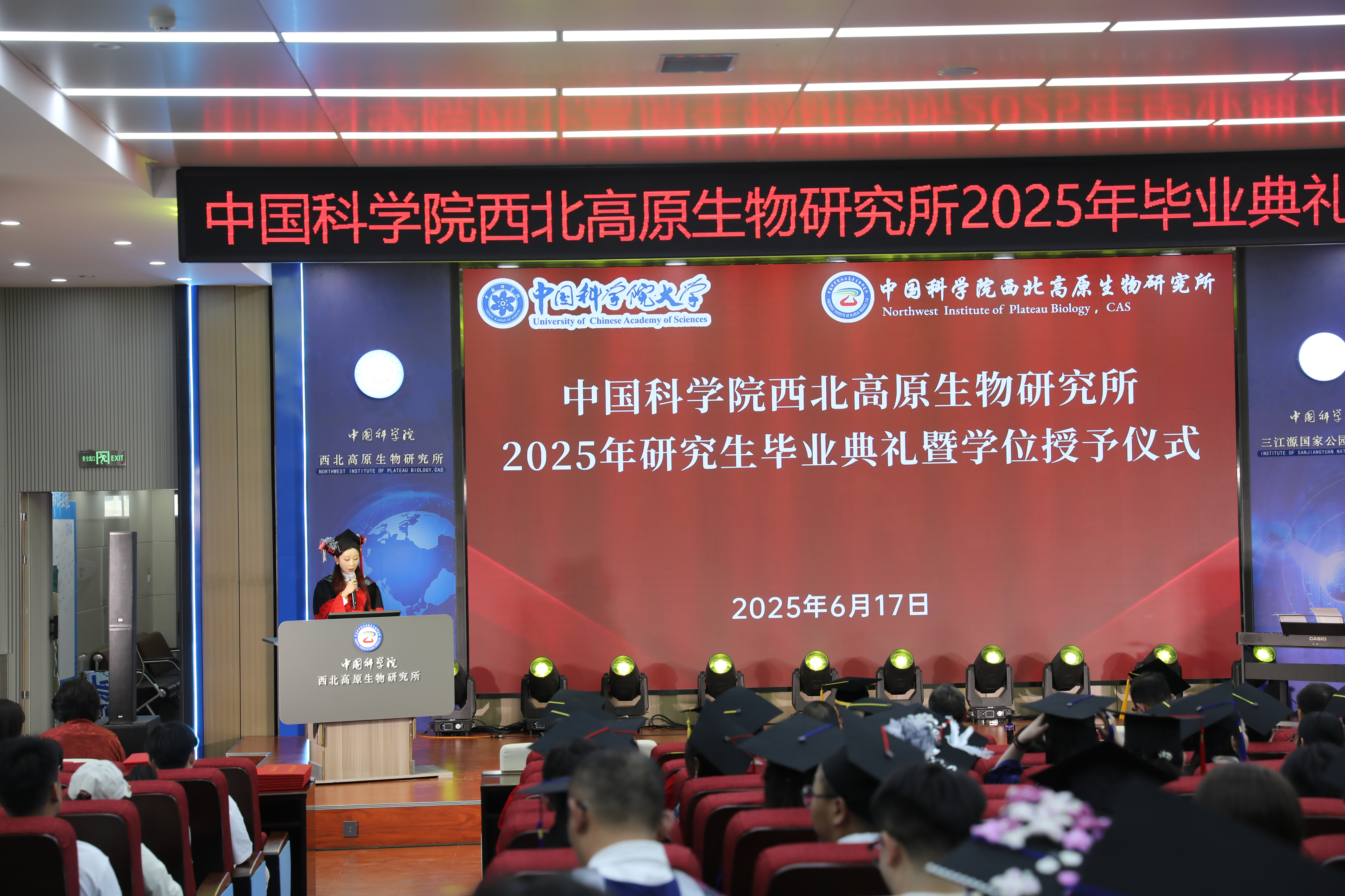 6 月 17 日,中國科學(xué)院西北高原生物研究所在 1 號(hào)樓學(xué)術(shù)報(bào)告廳隆重舉行2025年研究生畢業(yè)典禮暨學(xué)位授予儀式。西北高原所所長、黨委書記陳世龍,副所長楊其恩,全體畢業(yè)生導(dǎo)師,2025 屆全體畢業(yè)生及畢業(yè)生家長代表,在讀研究生共200余人齊聚一堂,共同見證這一重要時(shí)刻。