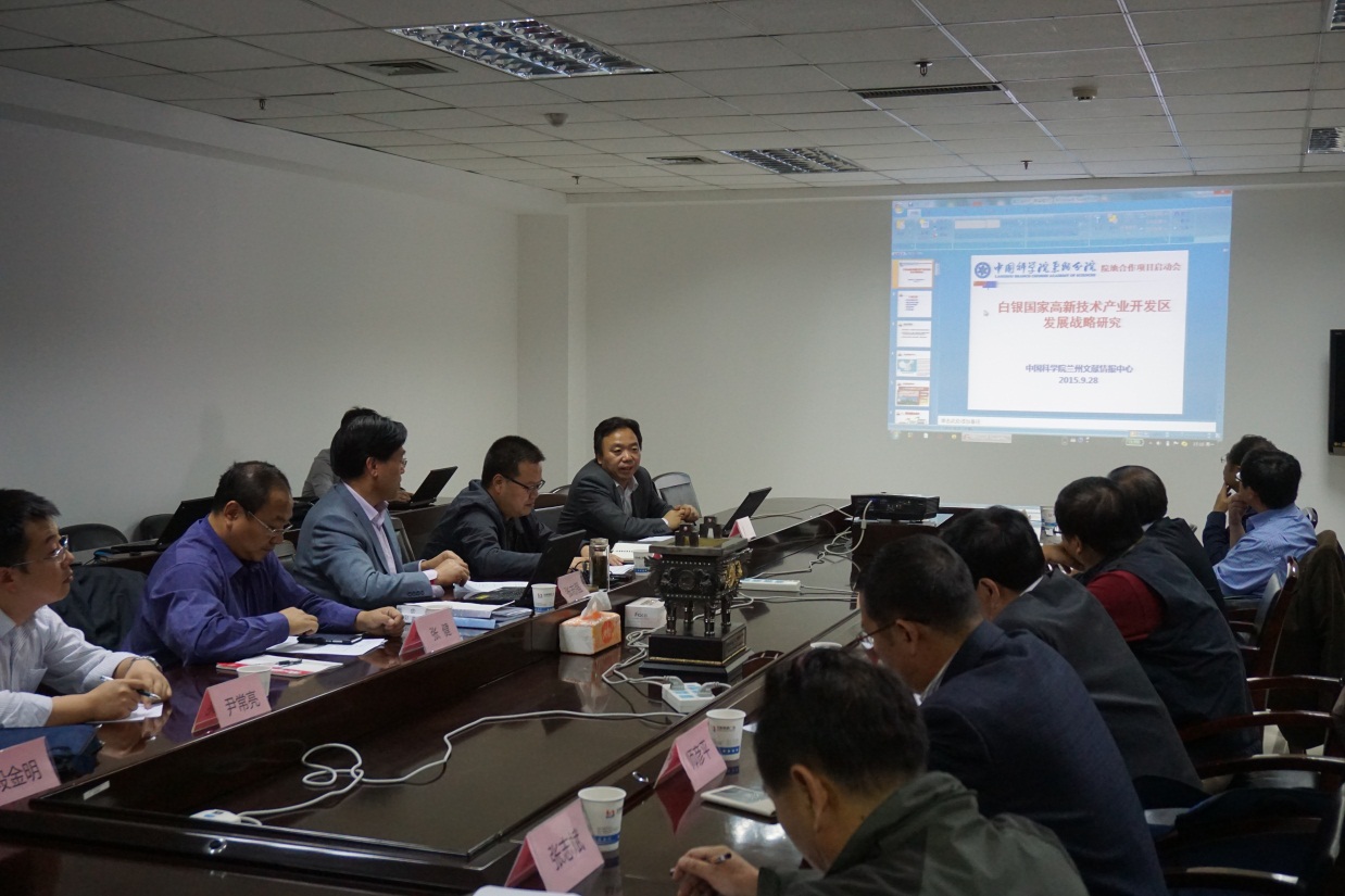 9月28日,“白銀國家高新技術(shù)開發(fā)區(qū)創(chuàng)新發(fā)展戰(zhàn)略研究”項目啟動會在中國科學(xué)院蘭州文獻情報中心召開,來自甘肅省政府研究室、中科院蘭州分院、中科院近代物理研究所、中科院蘭州化學(xué)物理研究所、西北師范大學(xué)、白銀國家高新技術(shù)開發(fā)區(qū)等單位的十位專家對項目研究方案進行了深入咨詢。會議由蘭州文獻情報中心主任張志強研究員主持,中國科學(xué)院蘭州分院副院長楊青春、院長助理張健以及院地科技合作處負責(zé)人等參加了會議。